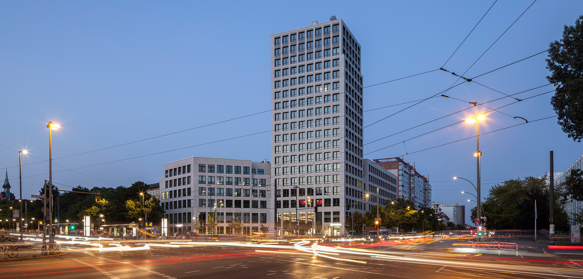 Am Rathauspark in Berlin-Lichtenberg entstand ein autofreies, klimafreundliches Büro- und Wohnquartier mit 387 Wohnungen und einer Kita sowie zahlreichen Büro- und Gewerbeflächen. Wahrzeichen des Areals ist ein weithin sichtbarer Büroturm, der sich als neues „Tor zu Lichtenberg“ 18 Stockwerke in den Himmel reckt.