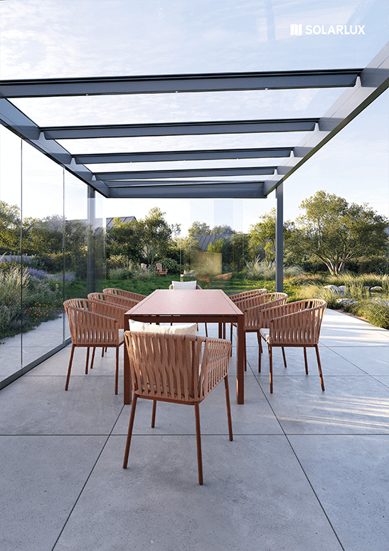 Le toit plat SDL Acubis séduit en termes de design et de fonctionnalité et peut tout aussi bien être monté comme structure autonome que relié à la maison. La statique intérieure du système de profilés non isolé confère au toit une élégance discrète. La pente du toit de seulement 2° est à peine visible à l'œil nu mais elle garantit un drainage de la surface du toit. Un raccord mural plat monobloc apporte une légèreté visuelle et permet également un montage aisé sur le chantier. SDL Acubis a eu la "Mention Spéciale" du German Design Award 2019.